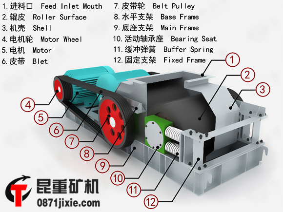 對(duì)輥式破碎機(jī)工作時(shí),破碎物料經(jīng)給料口落入兩輥?zhàn)又g,進(jìn)行擠壓破碎,成品物料自然落下。若遇過硬或不可破碎物時(shí),對(duì)輥式破碎機(jī)的輥?zhàn)涌蓱{液壓缸或彈簧的作用自動(dòng)退讓,使輥?zhàn)娱g隙增大,過硬或不可破碎物落下,從而保護(hù)機(jī)器不受損壞。相向轉(zhuǎn)動(dòng)的兩輥?zhàn)佑幸欢ǖ拈g隙,改變間隙,即可控制產(chǎn)品最大排料粒度。雙輥破碎機(jī)是利用一對(duì)相向轉(zhuǎn)動(dòng)的圓輥,四輥破碎機(jī)則是利用兩對(duì)相向轉(zhuǎn)動(dòng)的圓輥進(jìn)行破碎作業(yè)。