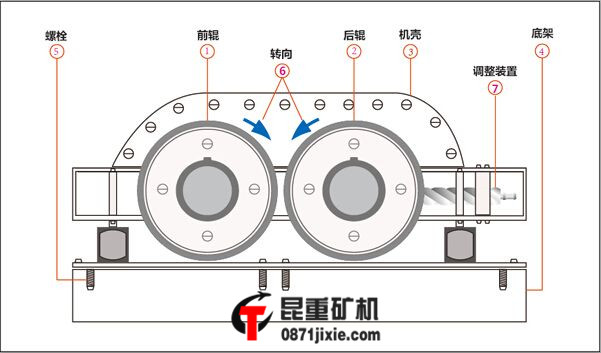 兩輥輪之間裝有楔形或墊片調(diào)節(jié)裝置,楔塊向上拉起時(shí),楔塊將活動(dòng)輥輪頂離固定輪,兩輥輪間隙變大,出料粒度變大,當(dāng)楔塊向下時(shí),活動(dòng)輥輪在壓緊彈簧的作用下兩輪間隙變小,出料粒度變小。墊片裝置通過增減墊片數(shù)量或厚薄來調(diào)節(jié)出料粒度大小,增加墊片時(shí)兩輥輪間隙變大,出料粒度變大。