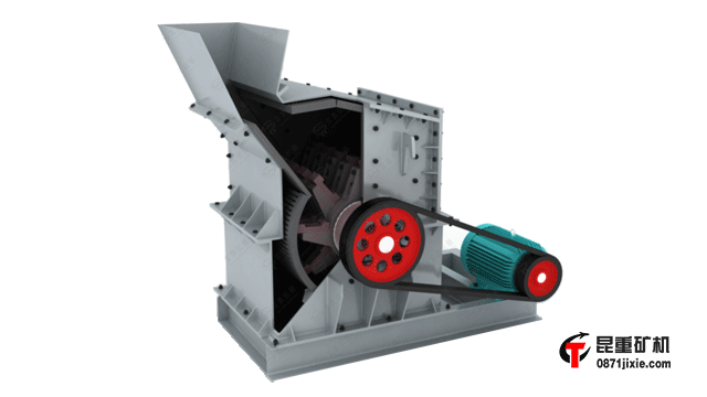 高效細碎機的主要工作部件為帶有錘子(又稱錘頭)的轉(zhuǎn)子。轉(zhuǎn)子由主軸、圓盤、銷軸和錘子組成。電動機帶動轉(zhuǎn)子在破碎腔內(nèi)高速旋轉(zhuǎn)。物料自上部給料口給入機內(nèi),受高速運動的錘子的打擊、沖擊、剪切、研磨作用而粉碎。在轉(zhuǎn)子下部,設(shè)有篩板、粉碎物料中小于篩子L尺寸的粒級通過篩板排出,大于篩子L尺寸的粗粒級阻留在篩板上繼續(xù)受到錘子的打擊和研磨,最后通過篩板排出機外。