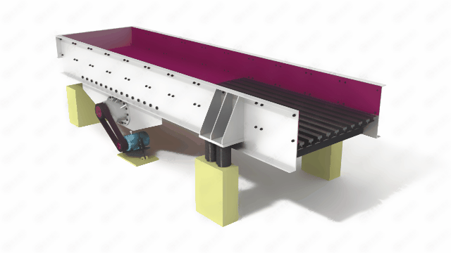 料槽配置單層篦條,可以對物料進行簡單預篩分,能有效去除原料中的細料和雜質,柵條間隙可調,可防止物料堵塞。
